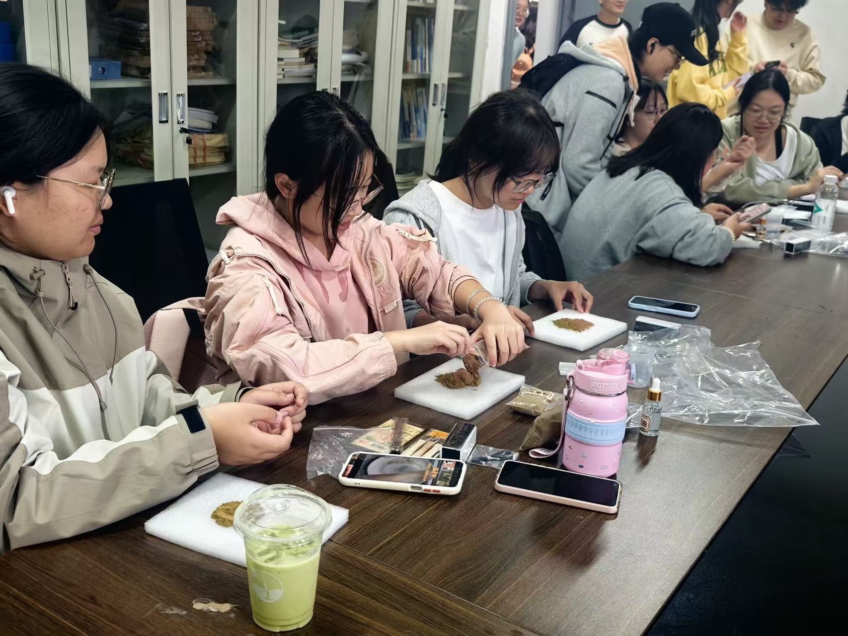 活动中期,进入实践环节,同学们纷纷拿起准备好的各式香珠、配饰与丝线,开始精心构思并制作属于自己的独特手链。现场气氛热烈,众人埋首精工串珠,亦与同伴轻语交流。但见巧手翻飞间,颗颗香珠已精巧成串。